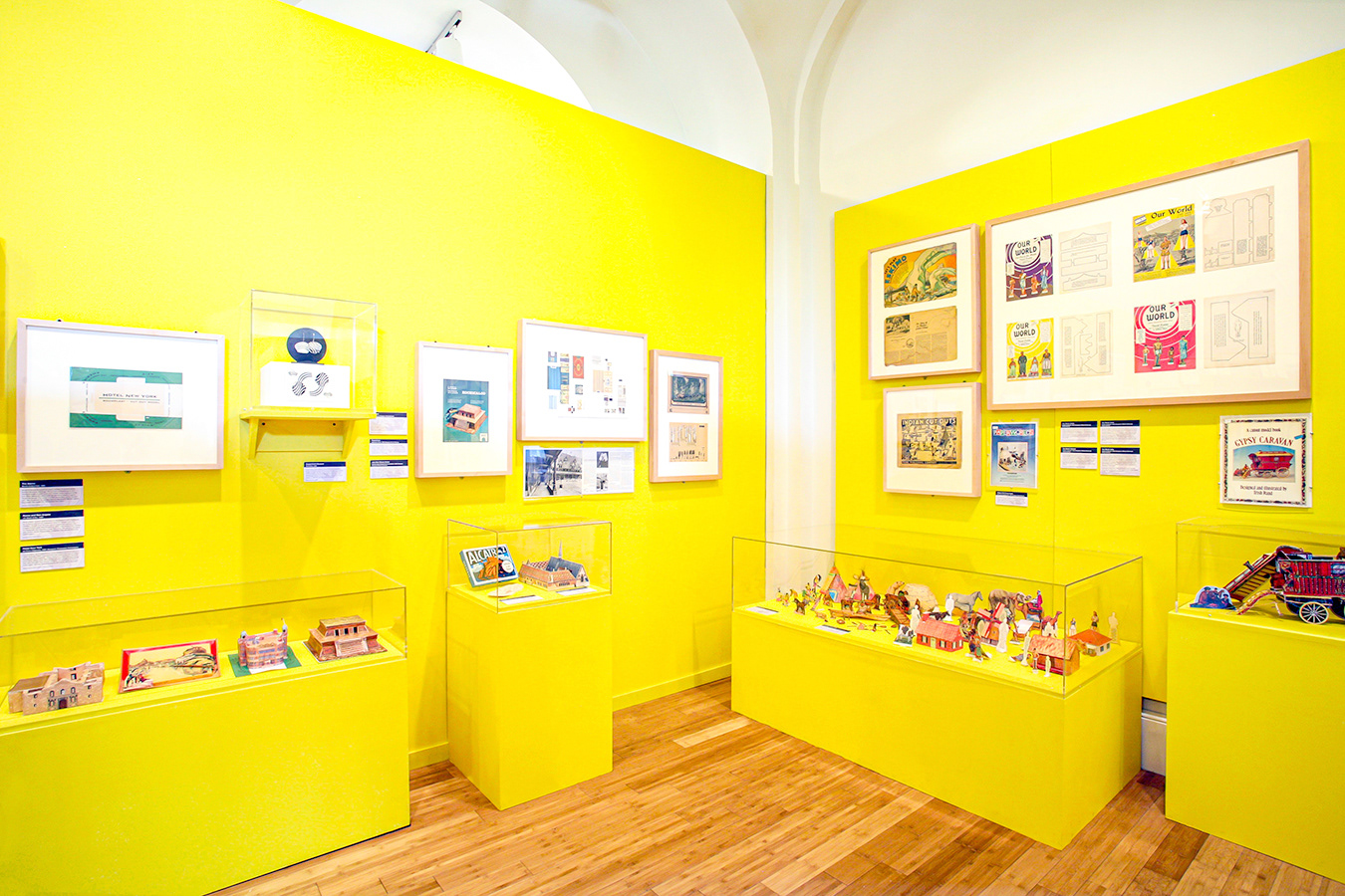 Organized into themes such as Modernism, Historic & Cultural Sites, and Religion, the exhibition invited visitors to draw connections across geography and style. Models were shown both assembled in vitrines and disassembled and framed, revealing their craftsmanship and construction. An introductory “island” anchored the gallery and drew visitors in from Cool & Collected, while perimeter displays established rhythm and flow. Bright yellow walls—evoking the playfulness of paper—energized the space and reinforced the spirit of discovery.
