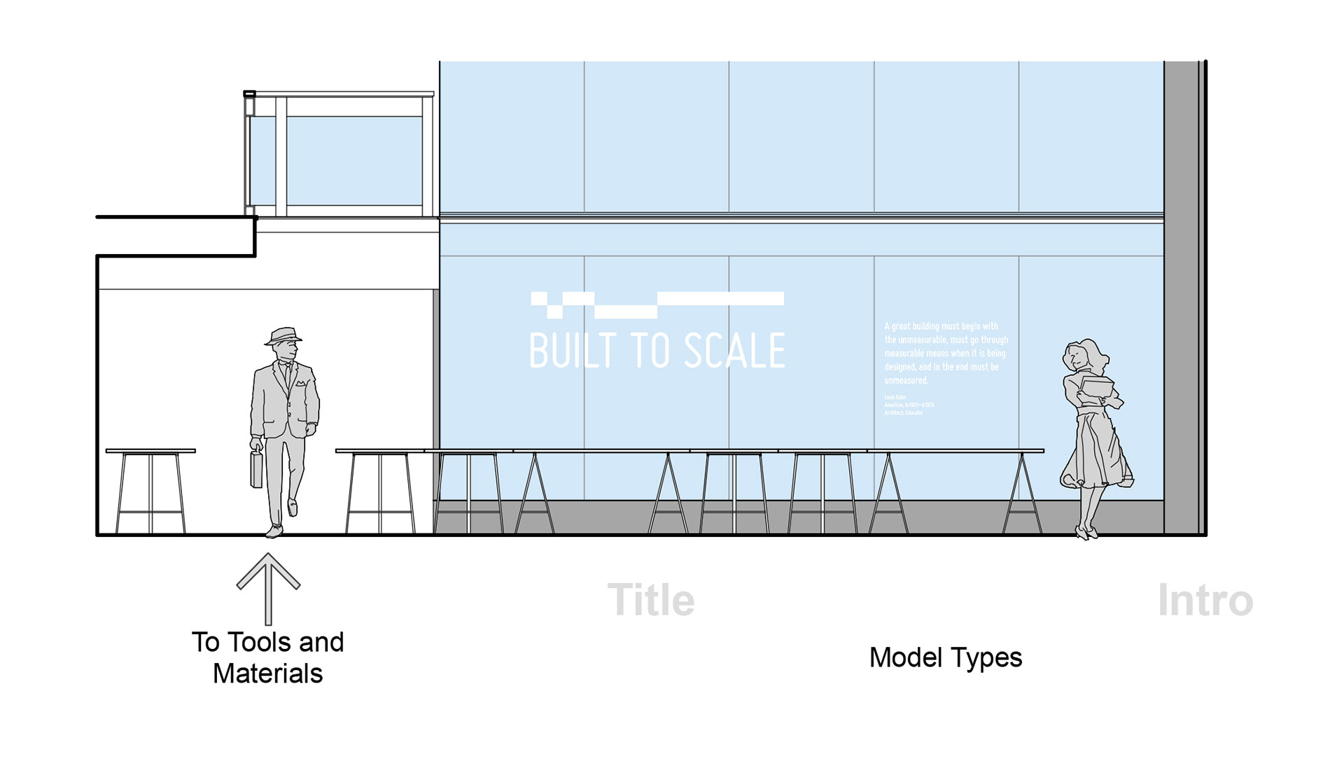 The title wall displayed the title, along with the visual identity, and featured a quote by renowned architect Louis Kahn: “A great building must begin with the unmeasurable, must go through measurable means when it is being designed, and in the end must be unmeasured.”