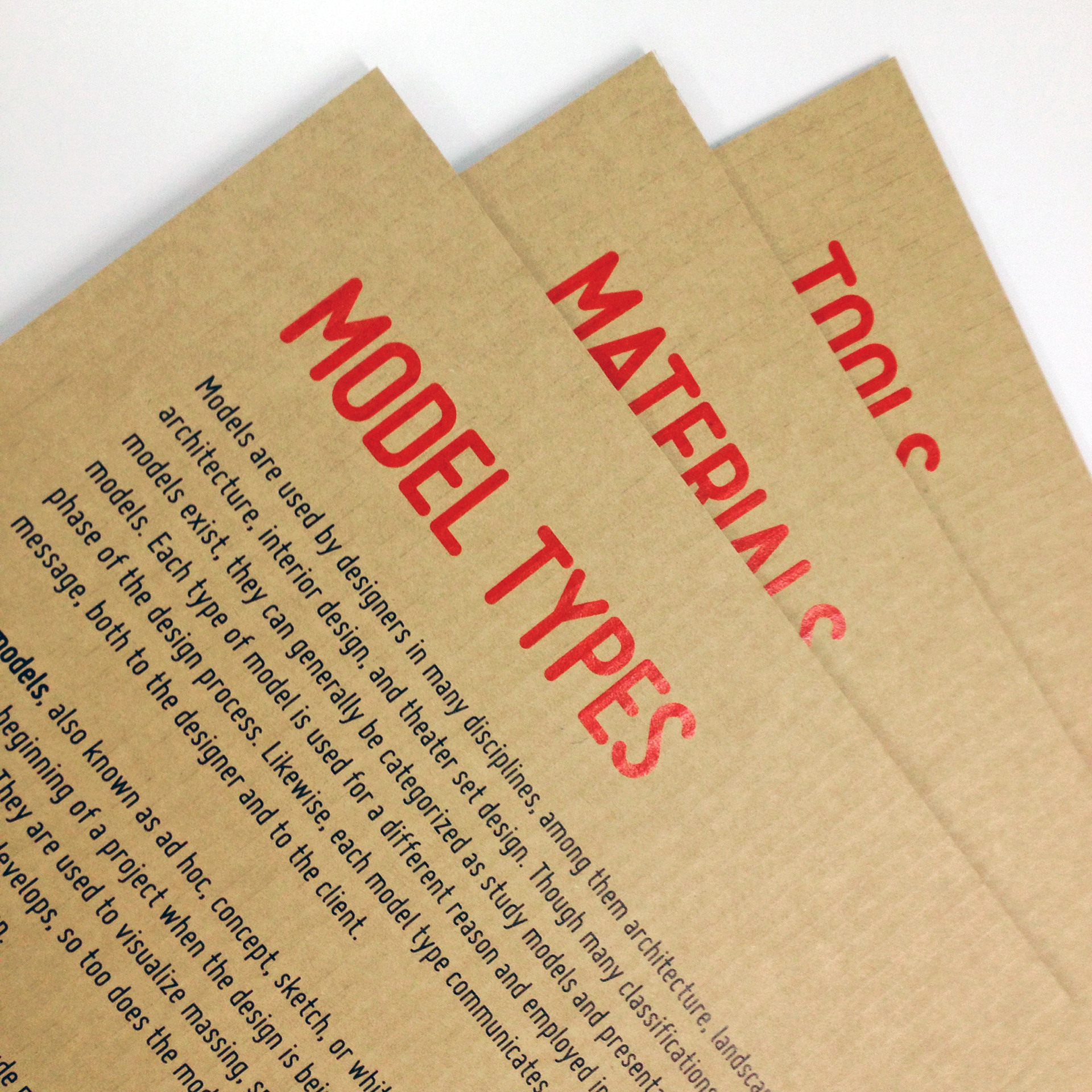 Corrugated cardboard and chipboard—common materials in model-making—served as ideal substrates for the topic and labeling texts, while the postcard highlighted the visual identity, title, and selected models on display.