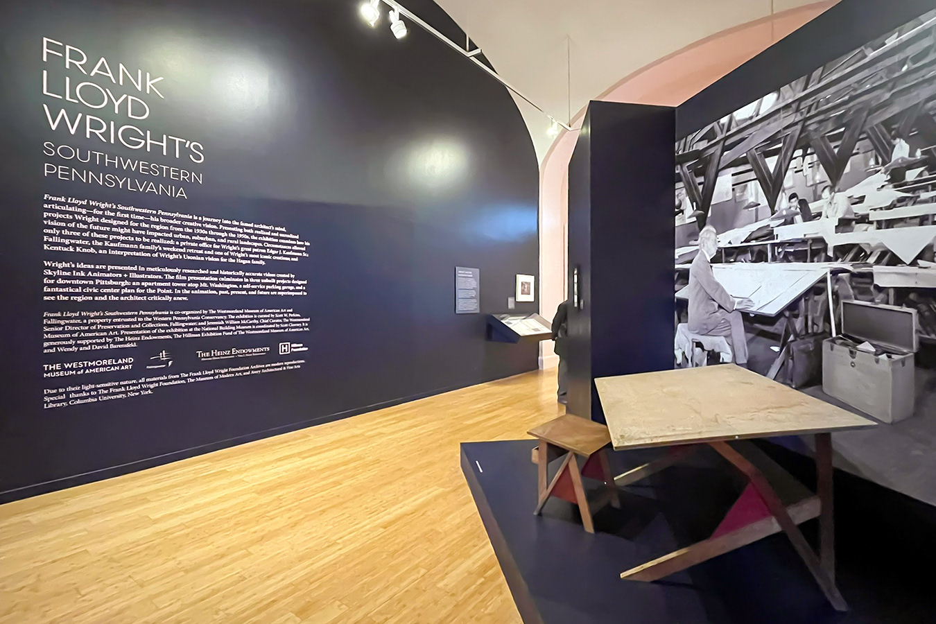 An immersive mural of Wright in his Taliesin drafting room, anchored by his drafting table and stool, greeted visitors at the exhibition entrance. As they moved through the galleries, animations transformed unbuilt designs into vivid possibilities. The tri-screen finale enveloped visitors in his visionary world, leaving many inspired by the ambition and imagination behind his work.