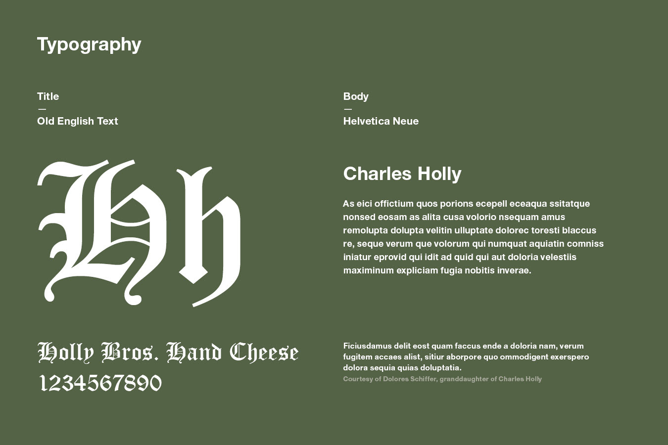 Old English Text, based on William Caslon's 1760 design and resembling German-style Fraktur blackletter, was used for panel titles, inspired by a Holly Bros. cheese wrapper. Helvetica Neue was chosen for the body text because of its readability.