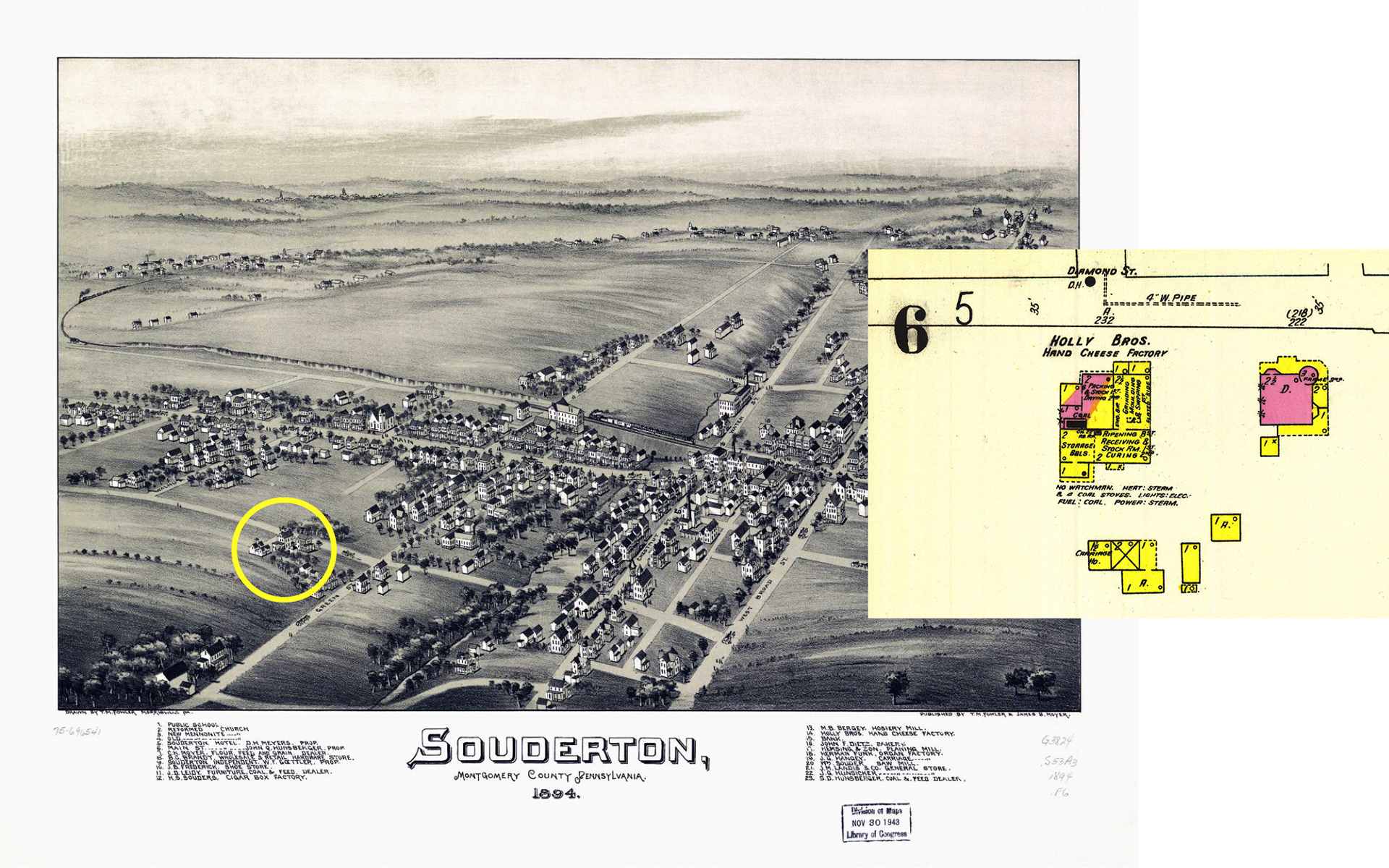 Two years after moving from Hilltown Township in Bucks County to Souderton, the Holly Bros. Hand Cheese factory, marked as number 14 and outlined in yellow, appeared on a 1894 bird’s-eye view map of the town. Thirty years later, the factory, along with the home of Charles and Elizabeth Holly, was shown on a Sanborn Fire Insurance Map. These maps, used from 1867 to the 1990s, helped insurance companies evaluate fire risk by displaying land uses, street names, utilities, and building shapes, heights, and functions.