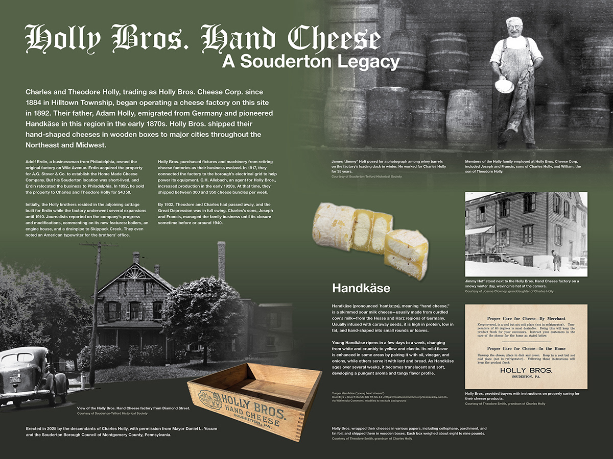In 1884, Charles and Theodore Holly expanded their father’s Handkäse enterprise into Holly Bros. Cheese Corp., producing hand-shaped cheeses that were packed in wooden boxes and shipped throughout the Northeast and Midwest. The Souderton business thrived until the Great Depression brought operations to a close.